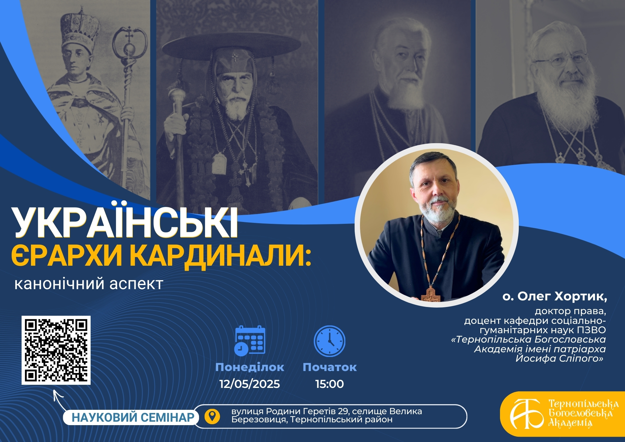 Запрошення на відкритий науковий семінар Тема доповіді:«Українські єрархи кардинали: канонічний аспект» Доповідач:о. Олег Хортик, доктор права, доцент кафедри соціально-гуманітарних наук ПЗВО «Тернопільська Богословська Академія імені патріарха Йосифа Сліпого» Про семінар: Буде…